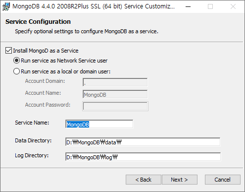 - Install MongoDB Compass는 설치하지 않도록 체크 해제