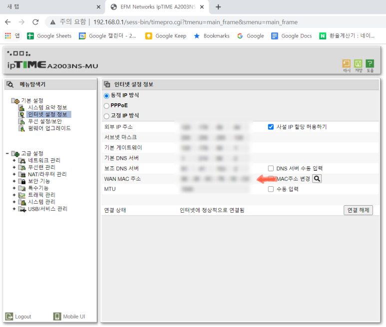 Iptime 공유기에 유선으로 접속 (192.168.0.1) 해서, ID&PW를 넣고 설정으로 들어가서 나오는 MAC 주소를 상담원에게 알려주었다.