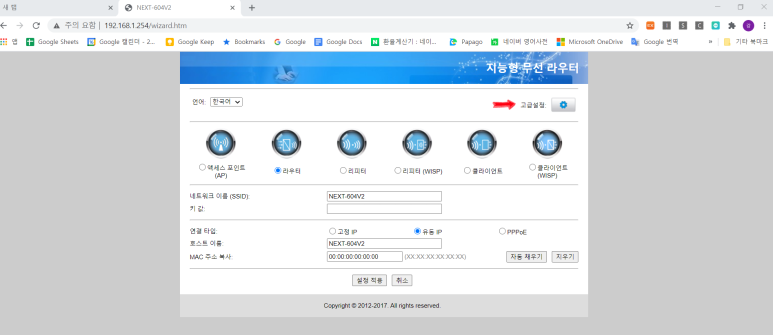 초기 설정을 위해 유선으로 연결하고 192.168.1.254 로 접속하니 기본으로 위와 같이 나온다.