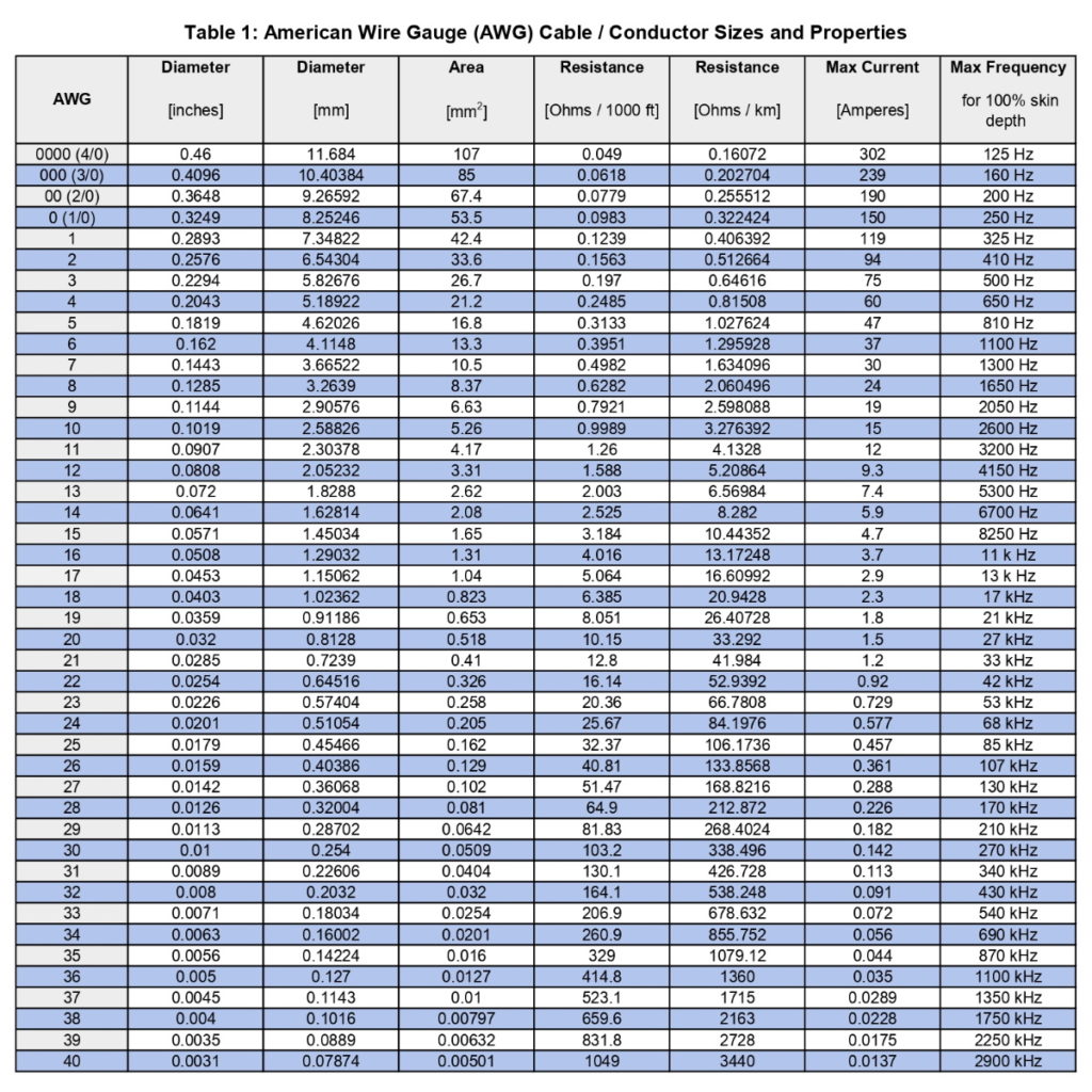 부하에서 끌어당겨 쓸 것으로 예상되는 전류가 무엇이든 안전하게 지원할 수 있는 최소 전선 치수를 AWG 표 (AWG table) 를 보고 결정한다.