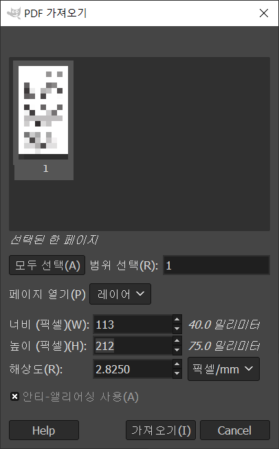 이미지 편집 프로그램 GIMP 으로 PDF를 열었을 때에는 resolution의 값으로 크기를 조절할 수 있었다.