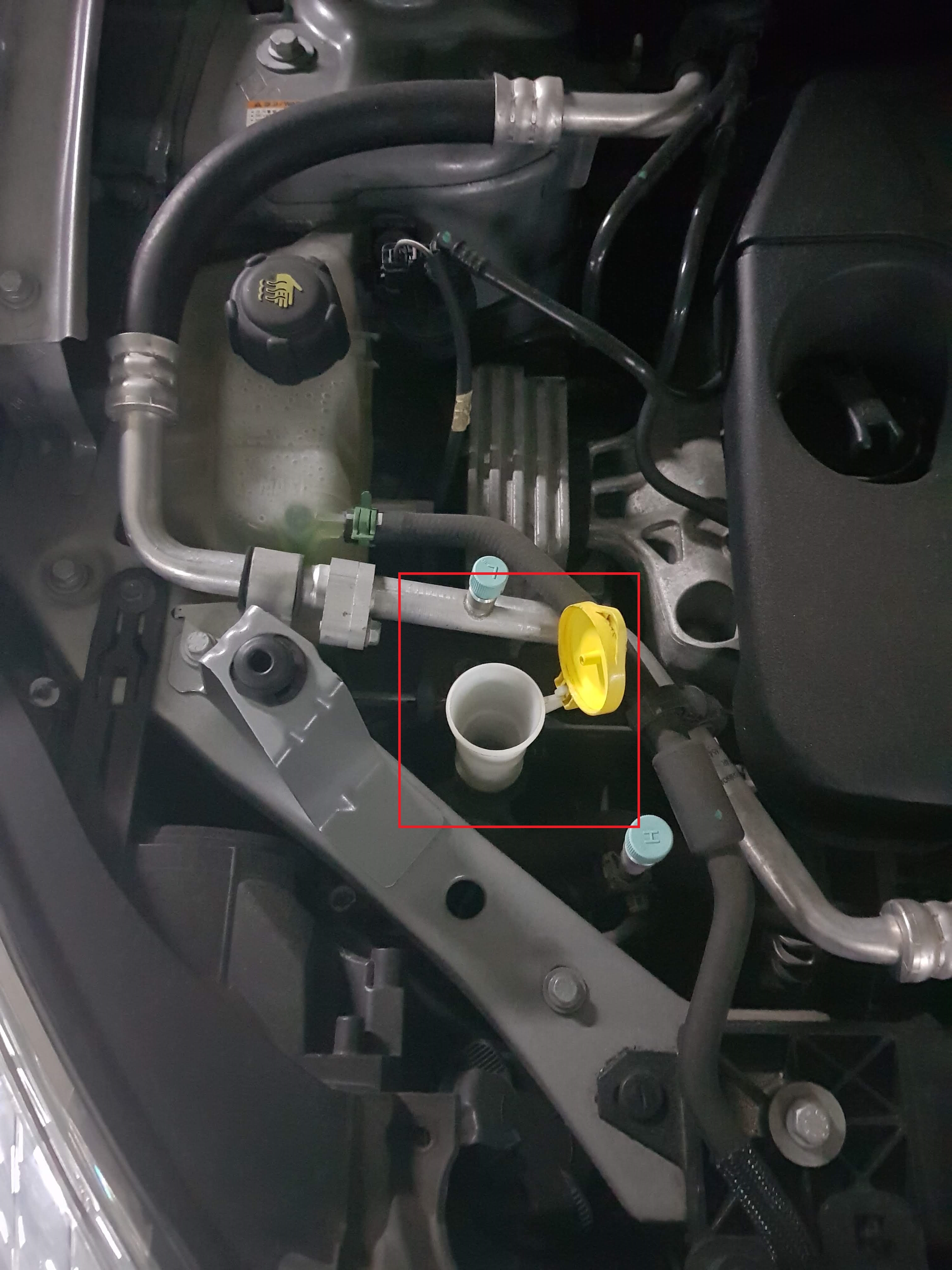 아래 사진의 워셔 액 주입 캡을 열고 워셔 액이 보일 때 까지 워셔 액을 보충하고 캡이 딱 소리가 날 때까지 닫는다.