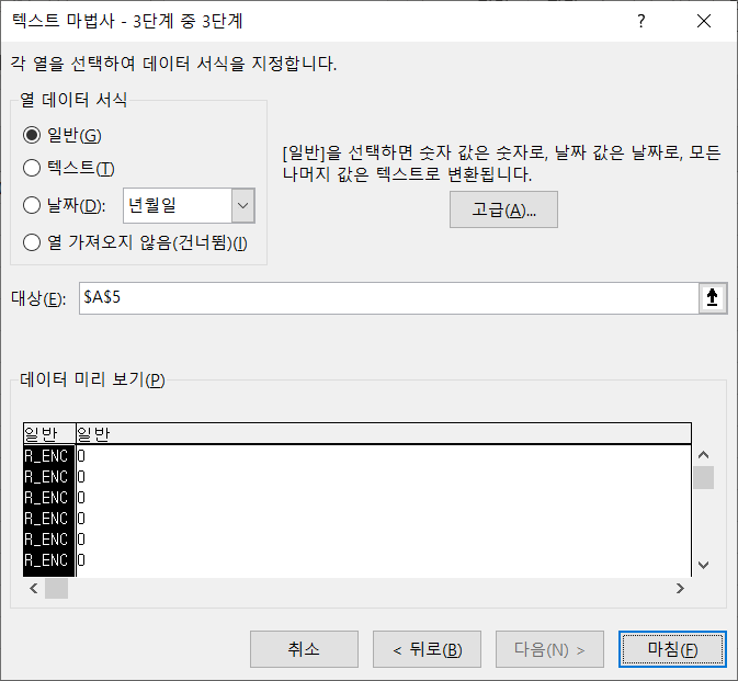 열면 로그한 내용이 첫 번째 열에 나온다. 텍스트를 구분할 항목을 선택한다.