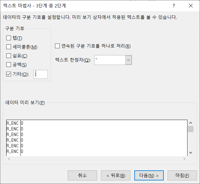 예로 든 데이터의 경우 ':' 으로 구분되어 있으므로 기타를 선택해서 ':' 을 입력하였다.