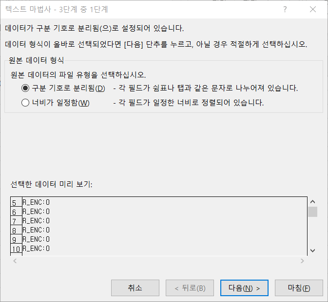 텍스트 마법사에서 구분자로 분리된 데이터 이므로 구분 기호로 분리됨을 선택 후 다음.