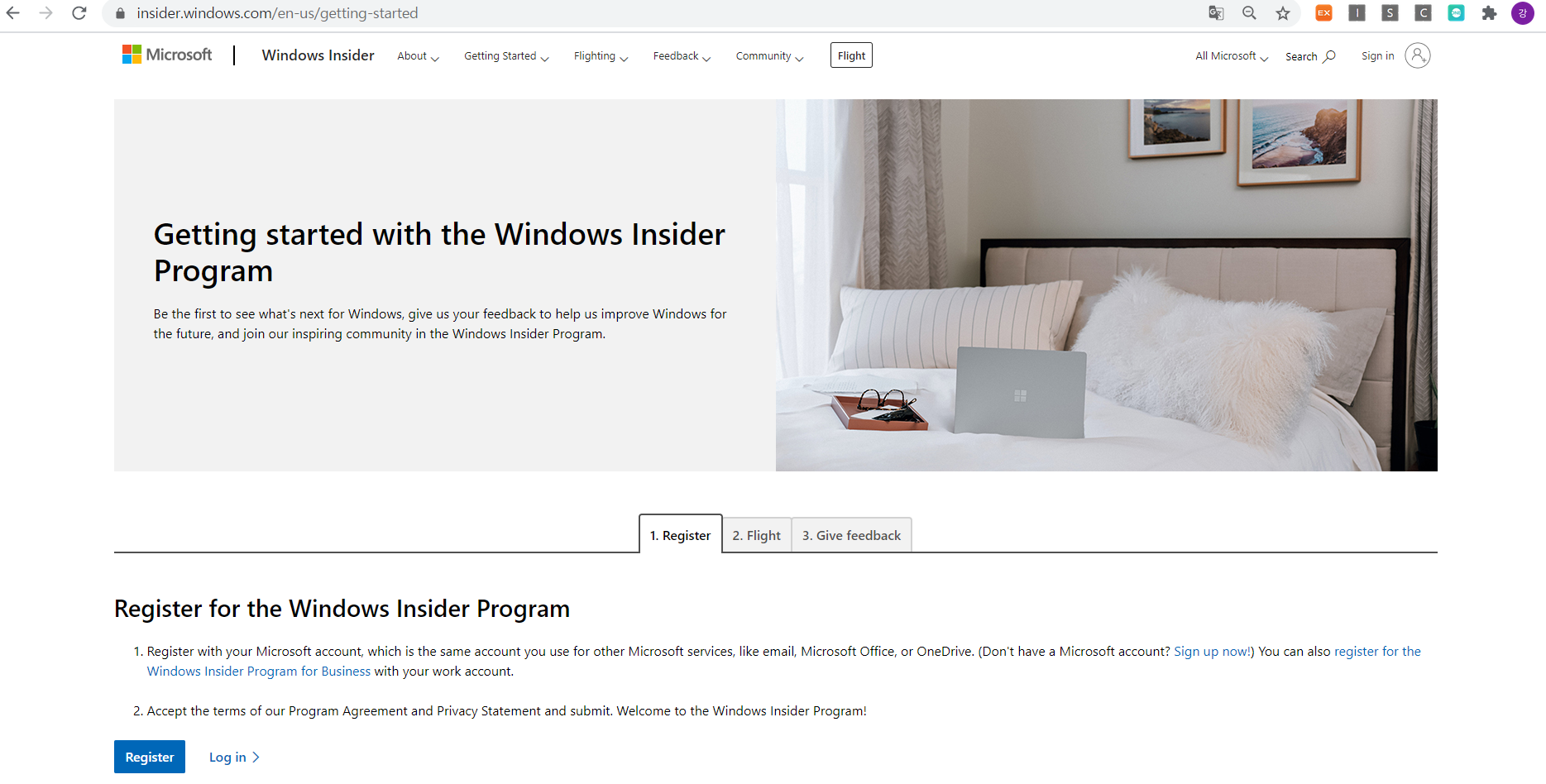 Register 를 한다. Log in 하라고 나와서 이미 가지고 있는 MS 계정으로 log in을 하였다.