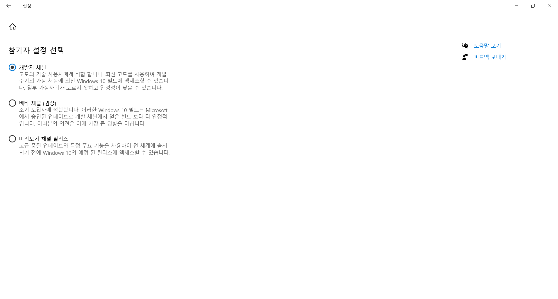 Windows 참가자 프로그램 설정에서 다시 개발자 채널로 변경하였다.