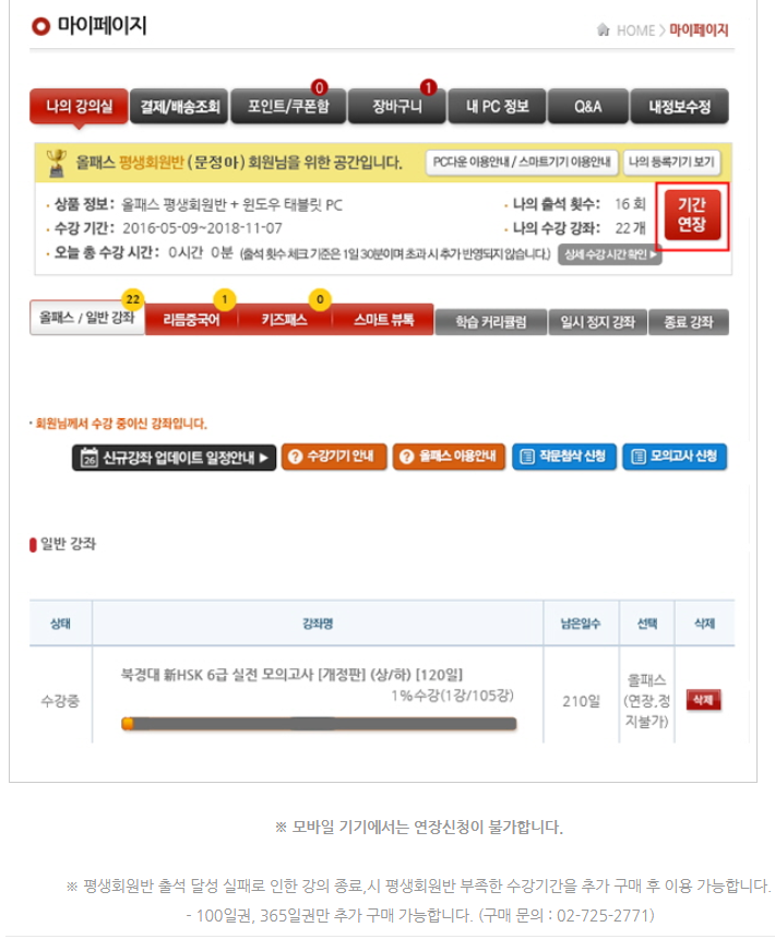 수강기간 연장 방법은 고객센터 메뉴에서 "연장"을 검색하면 나온다.