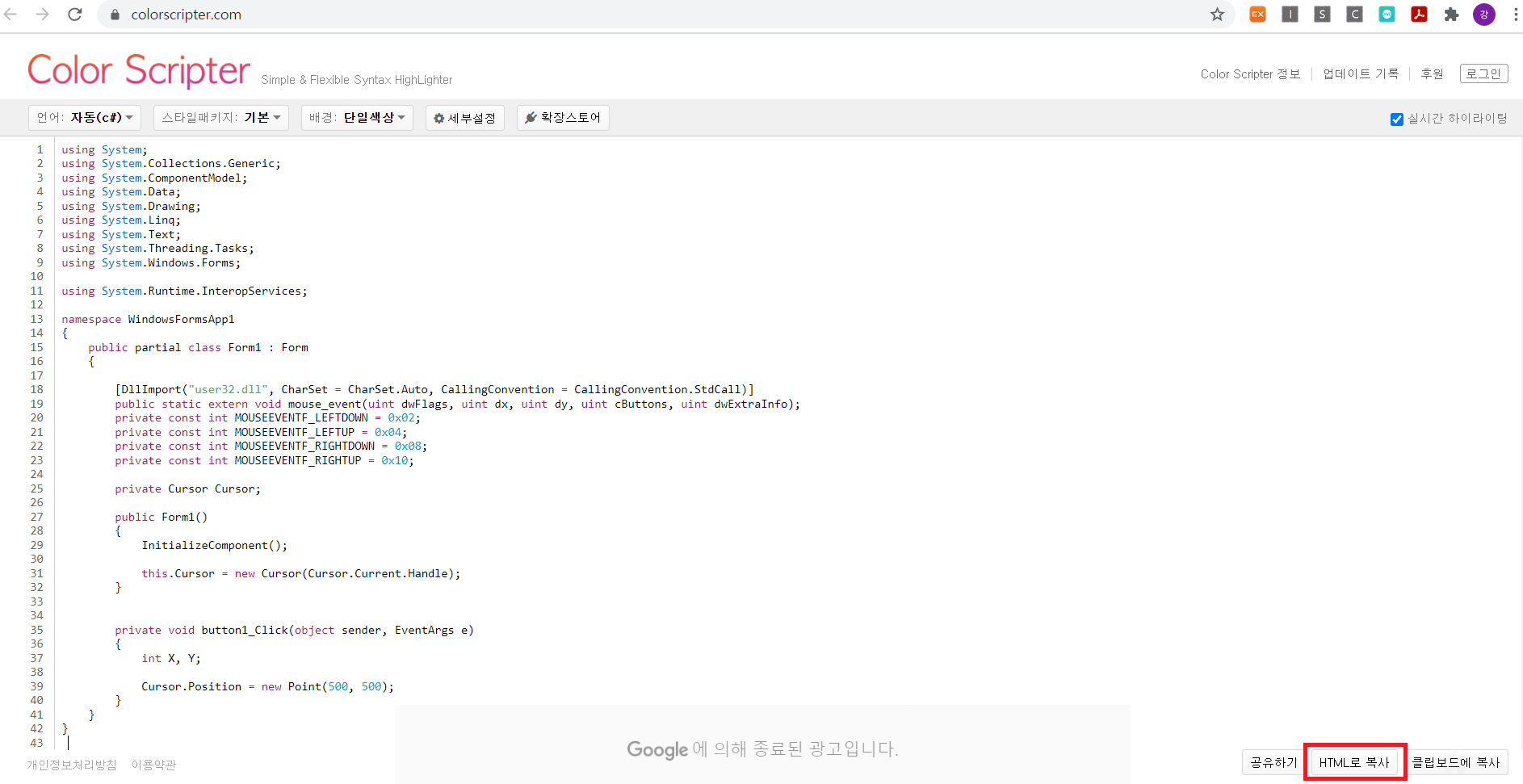 2. 왼쪽 아래의 HTML로 복사 버튼을 누른다.