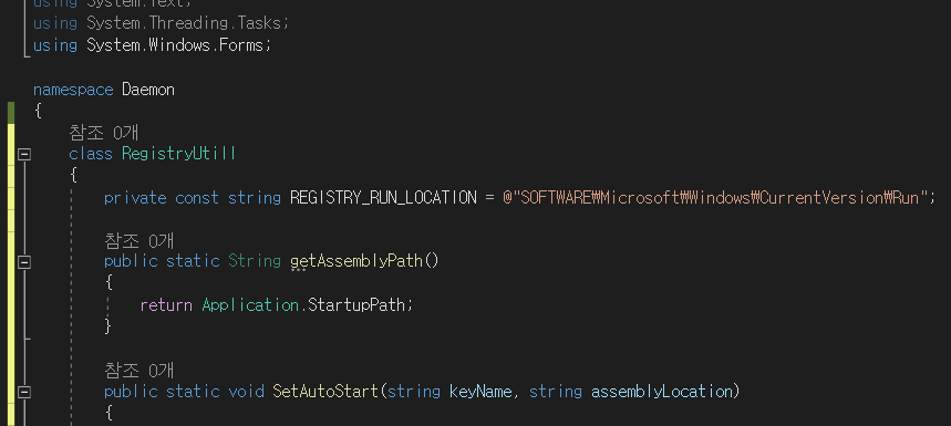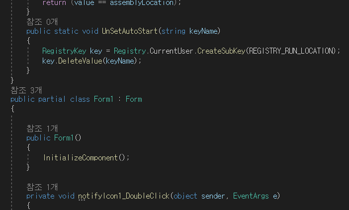 기본 Winform 프로젝트를 만들고 사용자 정의 class를 Form1.cs 소스 내에서 제일 위에 넣었더니 위와 같은