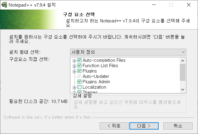 별도의 설정 없이 그냥 "다음", "동의함", "다음", "다음", "설치", "마침"