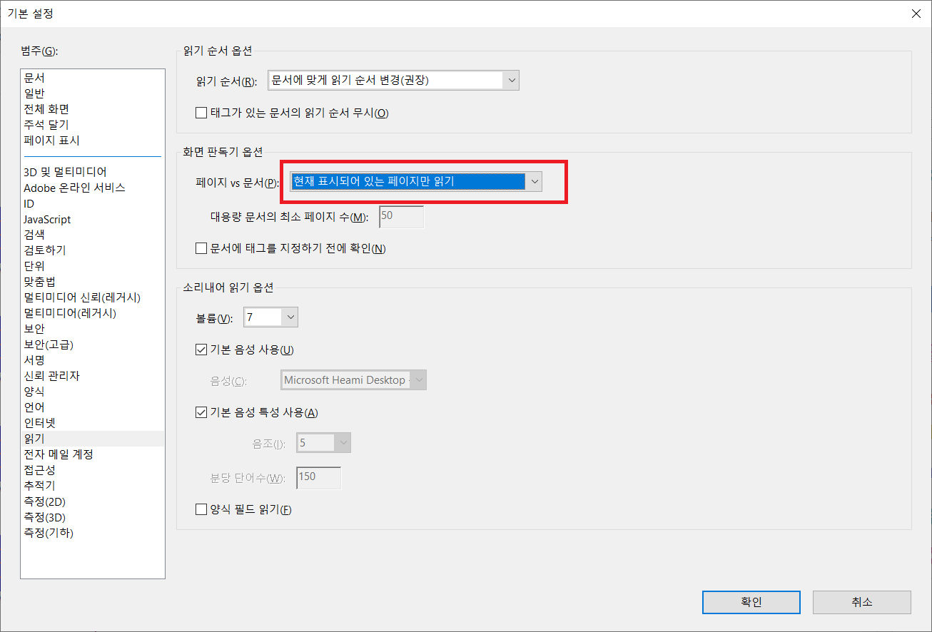 여기서 화면 판독기 옵션의 폐이지 vs 문서 부분의 설정을 아래와 같이