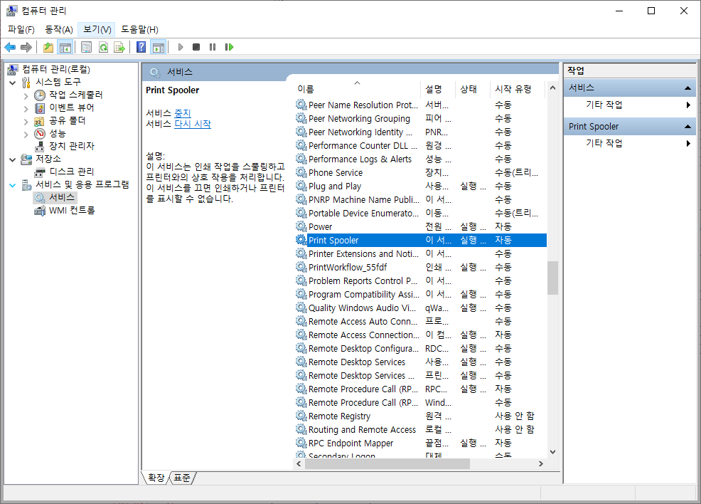 서비스 중에서 Print Spooler를 선택하여 오른쪽 클릭 >> 다시 시작 선택.