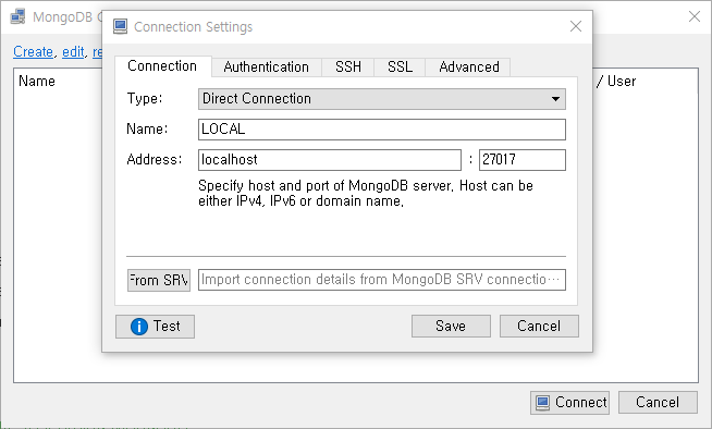 Port는 기본으로 설정된 27017 을 그대로 한 다음 설정을 Save.