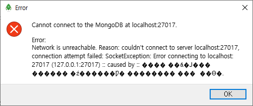 MongoDB server가 실행되지 않으면 위와 같이 에러가 발생한다.