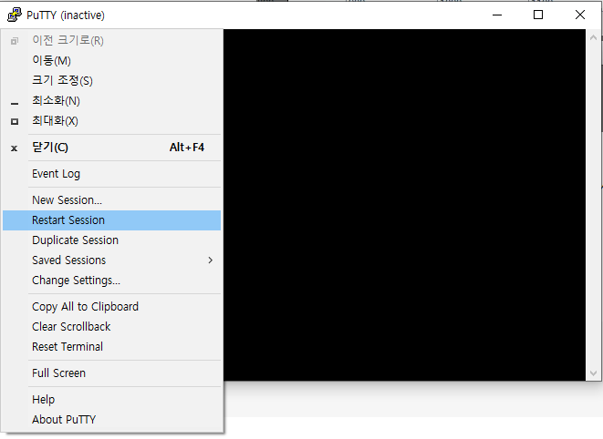PuTTy의 시스템 메뉴 (왼쪽 위의 아이콘) 를 클릭 나오는 메뉴에서