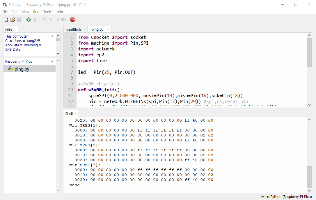 다시 Thonny를 실행하고 ping test 예제를 open, Save as로 Raspberry Pi Pico로 저장 후 실행.