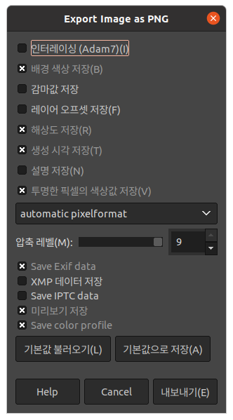 내보내기를 하면 아래와 같은 설정 창이 나타난다. 그냥 기본값으로 하면 이미지가 저장된다.