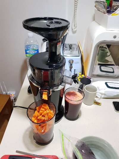 준비한 재료를 다 넣으니 사진에 보는 것처럼 착즙기에서 제공되는 쥬스컵 한컵이 나왔는데...
