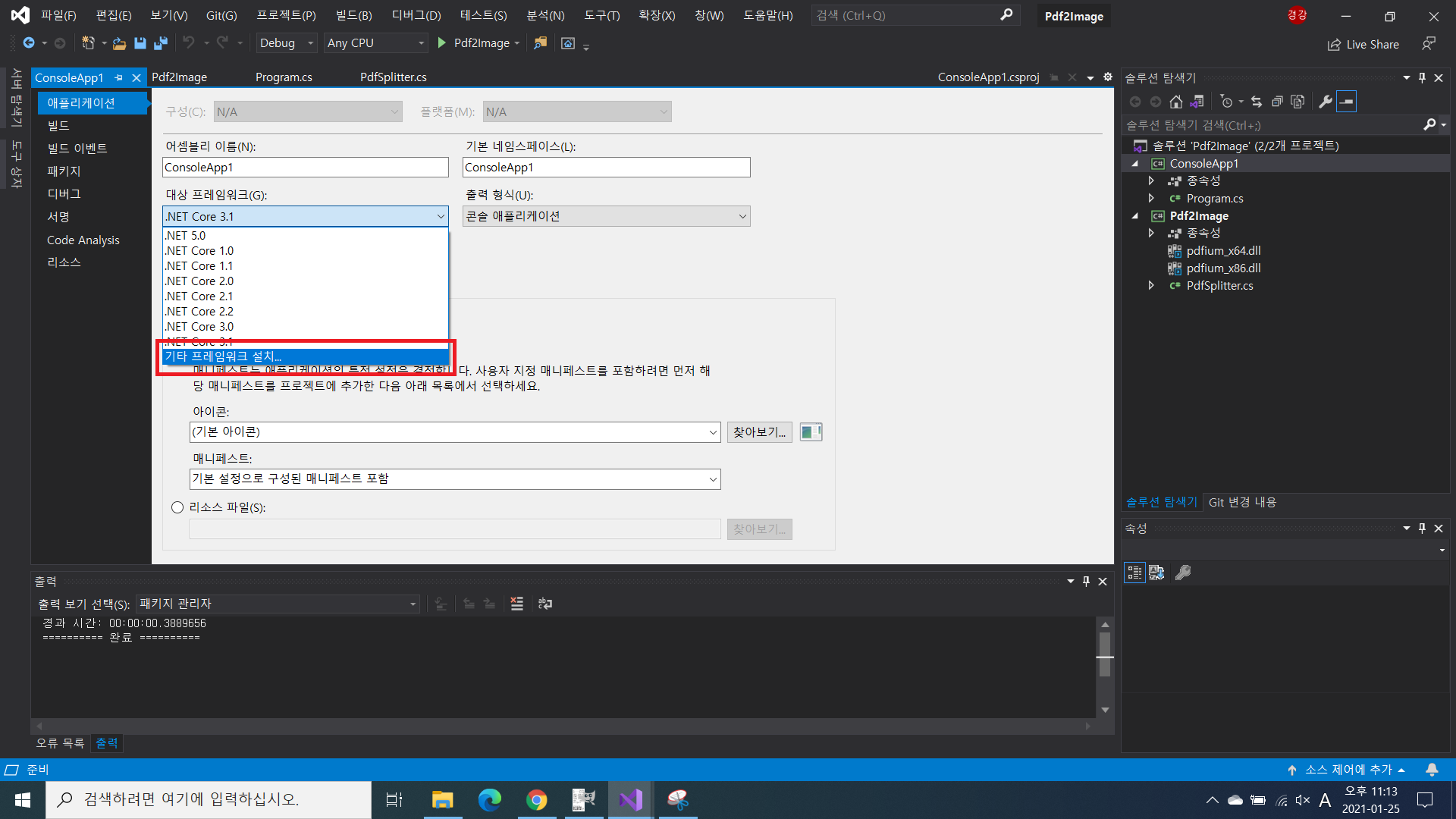 ConsoleApp1은 대상 프레임워크가 .NET Core 3.1 이다.